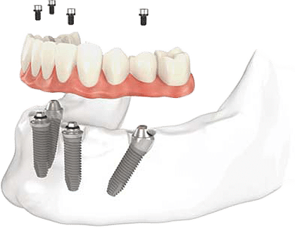 Four dental implants are inserted into your jawbone: two in front and two at the back, to provide stable support to the All-On-4 denture implants. These implants fuse with your jawbone in a process called osseointegration, which helps maintain the structure and appearance of your jawline.